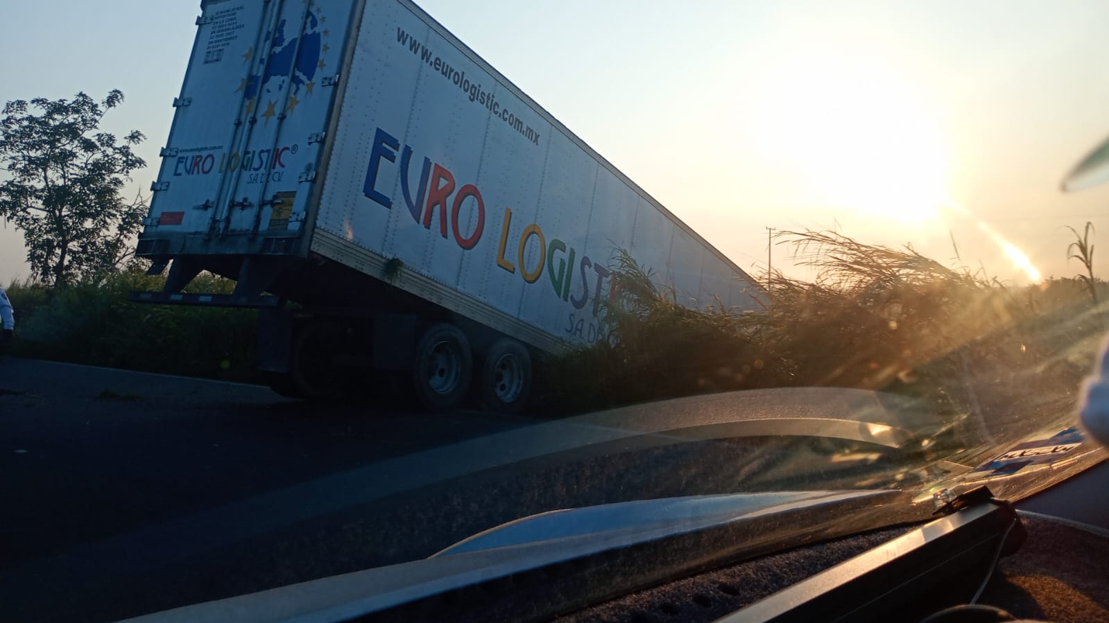 Se trata de un tráiler de la empresa euro logísticas dedicado al transporte de mercancía, de acuerdo a los datos se trató de una posible falla mecánica en el motor y del cual el chófer ya no pudo controlar la pesada unidad, abandonando la cinta asfáltica para ir a parar en medio del pantano, afortunadamente el conductor solo se llevó el susto de su vida.